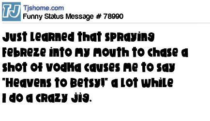 X Just learned that spraying Febreze into my mouth to chase a shot of vodka causes me to say "Heavens to Betsy!" a lot while I do a crazy jig.