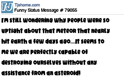 X I'm still wondering why people were so uptight about that meteor that nearly hit earth a few days ago....It seems to me we are perfectly capable of destroying ourselves without any assistance from an asteroid!