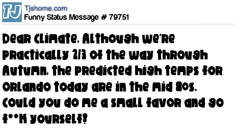 X Dear Climate, Although we're practically 2/3 of the way through Autumn, the predicted high temps for Orlando today are in the mid 80s. Could you do me a small favor and go f**k yourself?