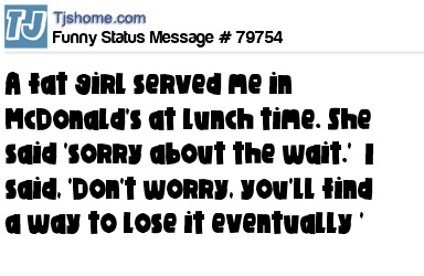 - # 31080 A fat chick served me at McDonalds earlier. She said, "Sorry about the wait". I said, "Don't worry darl, you'll lose it eventually".
