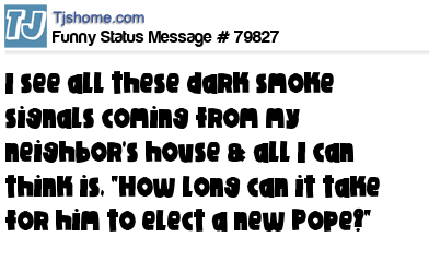 X I see all these dark smoke signals coming from my neighbor's house & all I can think is, "How long can it take for him to elect a new Pope?"