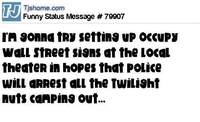 X  I'm gonna try setting up Occupy Wall Street signs at the local theater in hopes that police will arrest all the Twilight nuts camping out...