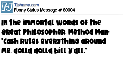 X says In the immortal words of the great Philosopher, Method Man: "Cash rules everything around me, dolla dolla bill y'all."