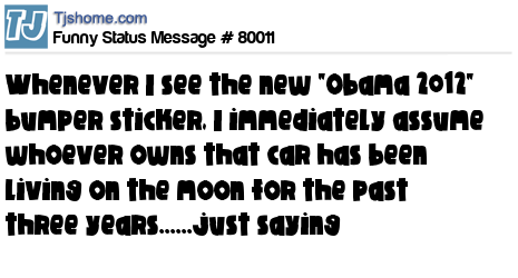 X Whenever I see the new "Obama 2012" bumper sticker, I immediately assume whoever owns that car has been living on the moon for the past three years......just saying