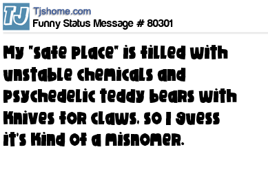 X  My "safe place" is filled with unstable chemicals and psychedelic teddy bears with knives for claws, so I guess it's kind of a misnomer.