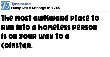 - # 16429 passed a homeless guy on the way to the Coinstar machine today. "Sorry, I have no change"...man was that awkward.....