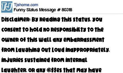 X Disclaimer: By reading this status, you consent to hold no responsibilty to the owner of this wall any embarrassment from Laughing Out Loud inappropriately, injuries sustained from internal laughter, or any @$$es that may have been laughed off.