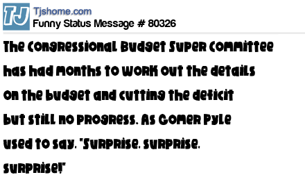 X The Congressional Budget Super Committee has had months to work out the details on the budget and cutting the deficit but still no progress. As Gomer Pyle used to say, "Surprise, surprise, surprise!"