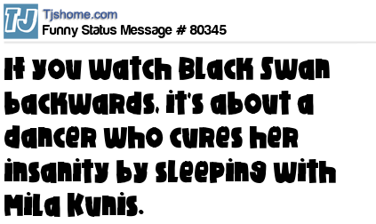 X If you watch Black Swan backwards, it's about a dancer who cures her insanity by sleeping with Mila Kunis.