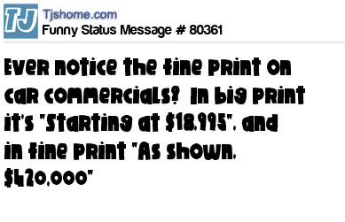 X Ever notice the fine print on car commercials? In big print it's "Starting at $18,995", and in fine print "As shown, $420,000"
