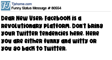 X says Dear New User; Facebook is a revolutionary platform. Don't bring your Twitter tendencies here. Here you are either funny and witty or you go back to Twitter.