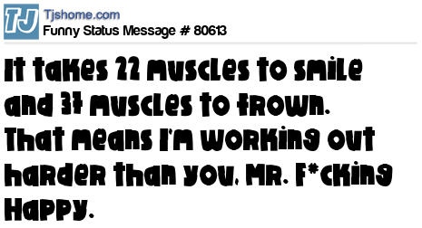 - # 71459 It takes more muscles to frown than to smile. Which proves that happy people are really f***ing lazy.
