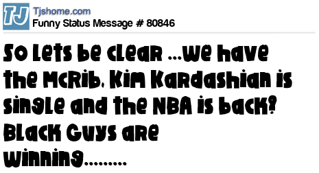 X So lets be clear ...we have the McRib, Kim Kardashian is single and the NBA is back? Black Guys are winning.........
