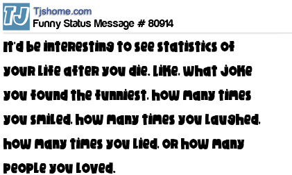 X It'd be interesting to see statistics of your life after you die. Like, what joke you found the funniest, how many times you smiled, how many times you laughed, how many times you lied, or how many people you loved.
