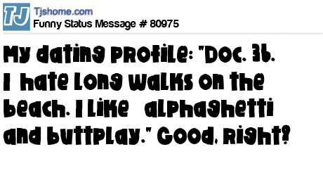 X is My dating profile: "Doc. 36. I hate long walks on the beach. I like alphaghetti and buttplay." Good, right?