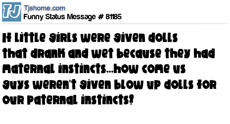 X  If little girls were given dolls that drank and wet because they had maternal instincts...how come us guys weren't given blow up dolls for our paternal instincts?
