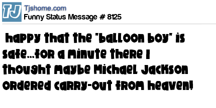 - # 8133 THANK GOD THEY FOUND BALLOON BOY! THOUGHT MICHAEL JACKSON WAS ORDERING TAKE OUT FROM HEAVEN.