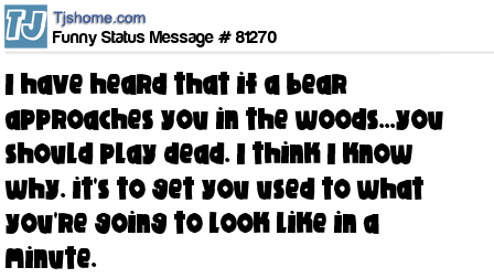 X is I have heard that if a bear approaches you in the woods...you should play dead. I think I know why. it's to get you used to what you're going to look like in a minute.