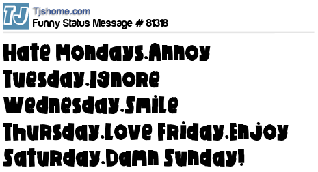 X says Hate Mondays.Annoy Tuesday.Ignore Wednesday.Smile Thursday.Love Friday.Enjoy Saturday.Damn Sunday!