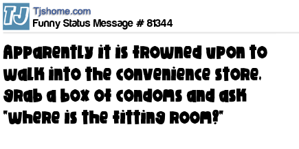 - # 106992 Whenever I buy a box of condoms I always look the cashier in the eyes and say ''Where's your fitting room?!''