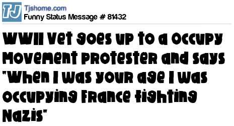 X is WWII Vet goes up to a Occupy Movement protester and says "When I was your age I was occupying France fighting Nazis"