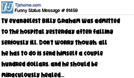X TV evangelest Billy Graham was admitted to the hospital yesterday after falling seriously ill. Don't worry though, all he has to do is send himself a couple hundred dollars, and he should be miraculously healed...
