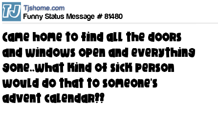 X is Came home to find all the doors and windows open and everything gone..what kind of sick person would do that to someone's advent calendar??