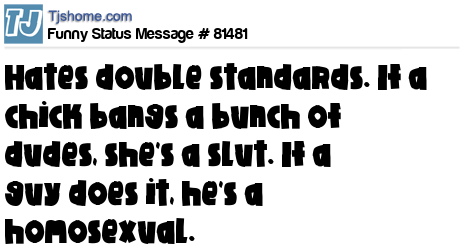 - # 66433 so sick of double standards. If a girl sleeps with a bunch of guys, she's a "ho"...but if a guy does the same thing, he's "gay".