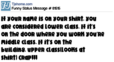 X If your name is on your shirt, you are considered lower class. If it's on the door where you work you're middle class. If it's on the building, upper class(looks at shirt) Crap!!!