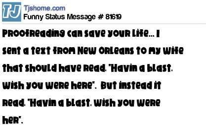 X proofreading can save your life... I sent a text from New Orleans to my wife that should have read, "Havin a blast, wish you were here". But instead it read, "Havin a blast, wish you were her".