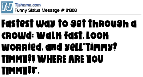 X Fastest way to get through a crowd: Walk fast, look worried, and yell"Timmy? TIMMY?! WHERE ARE YOU TIMMY?!".