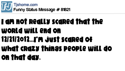 X I am not really scared that the world will end on 12/21/2012...I"m just scared of what crazy things people will do on that day.