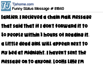 X Earlier, I recieved a chain mail message that said that if I don't forward it to 50 people within 3 hours of reading it, a little dead girl will appear next to my bed at midnight. I haven't sent the message on to anyone. Looks like I'm getting laid tonigh