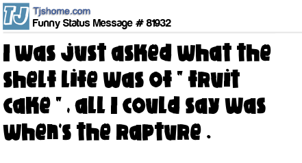X is I was just asked what the shelf life was of " fruit cake " , all I could say was when's the rapture .