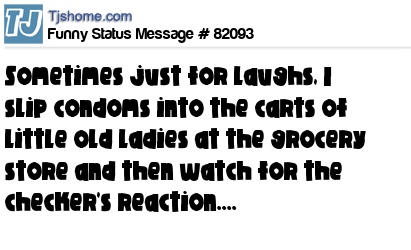 - # 27950 I like to slip condoms into the carts of little old ladies at the store and then watch their reactions when their checking out.