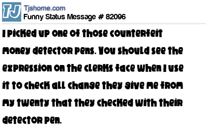 - # 137283 I bought a counterfeit money detector pen, You should see the expression on my dope mans face when I used it to check the change from the 8-ball...