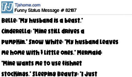 X Belle: "My husband is a beast." Cinderella: "Mine still drives a pumpkin." Snow White: "My husband leaves me home with 7 little ones." Mermaid: "Mine wants me to use fishnet stockings." Sleeping Beauty: "I just pretend i'm asleep." Disney's Desperate Hous