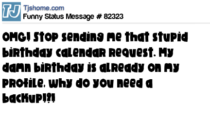 X OMG! Stop sending me that stupid birthday calendar request. My damn birthday is already on my profile, why do you need a backup!?!