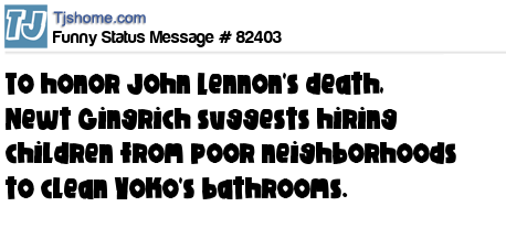 X  To honor John Lennon's death, Newt Gingrich suggests hiring children from poor neighborhoods to clean Yoko's bathrooms.