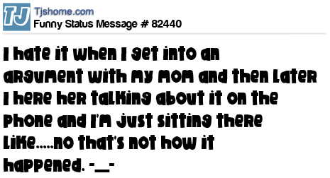 X I hate it when I get into an argument with my mom and then later I here her talking about it on the phone and I'm just sitting there like.....no that's not how it happened. -__-