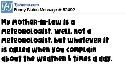 X My mother-in-law is a meteorologist. Well, not a meteorologist, but whatever it is called when you complain about the weather 6 times a day.