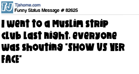 X is I went to a Muslim strip club last night, everyone was shouting "SHOW US YER FACE"