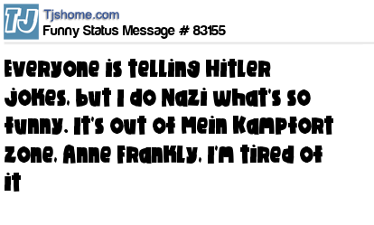 X says Everyone is telling Hitler jokes, but I do Nazi what's so funny. It's out of Mein Kampfort zone, Anne Frankly, I'm tired of it