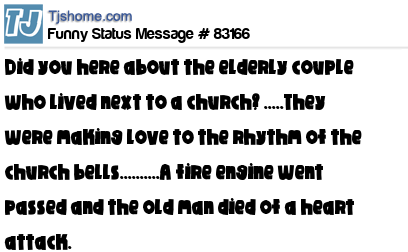 X  Did you here about the elderly couple who lived next to a church? .....They were making love to the rhythm of the church bells..........A fire engine went passed and the old man died of a heart attack.