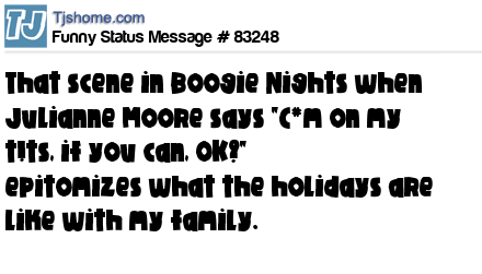 X That scene in Boogie Nights when Julianne Moore says "C*m on my t!ts, if you can, OK?" epitomizes what the holidays are like with my family.