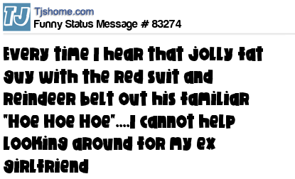 X says every time I hear that jolly fat guy with the red suit and reindeer belt out his familiar "Hoe Hoe Hoe"....I cannot help looking around for my ex girlfriend
