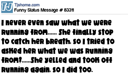 X is I never even saw what we were running from...... She finally stop to catch her breath, so I tried to asked her what we was running from?......She yelled and took off running again, so I did too.