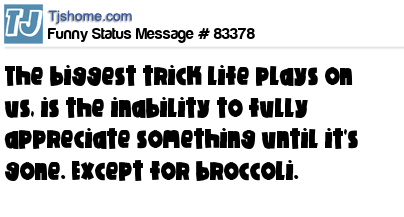X The biggest trick life plays on us, is the inability to fully appreciate something until it's gone. Except for broccoli.