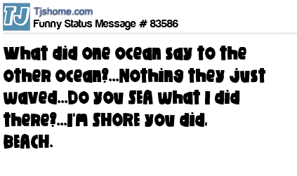- # 83969 What did one ocean say to the other ocean?...Nothing.. they just WAVED...Do you SEA what I did there?...I'm SHORE you did, BEACH. :)
