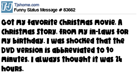 X is Got my favorite Christmas movie, A Christmas Story, from my in-laws for my birthday. I was shocked that the DVD version is abbreviated to 90 minutes. I always thought it was 24 hours.